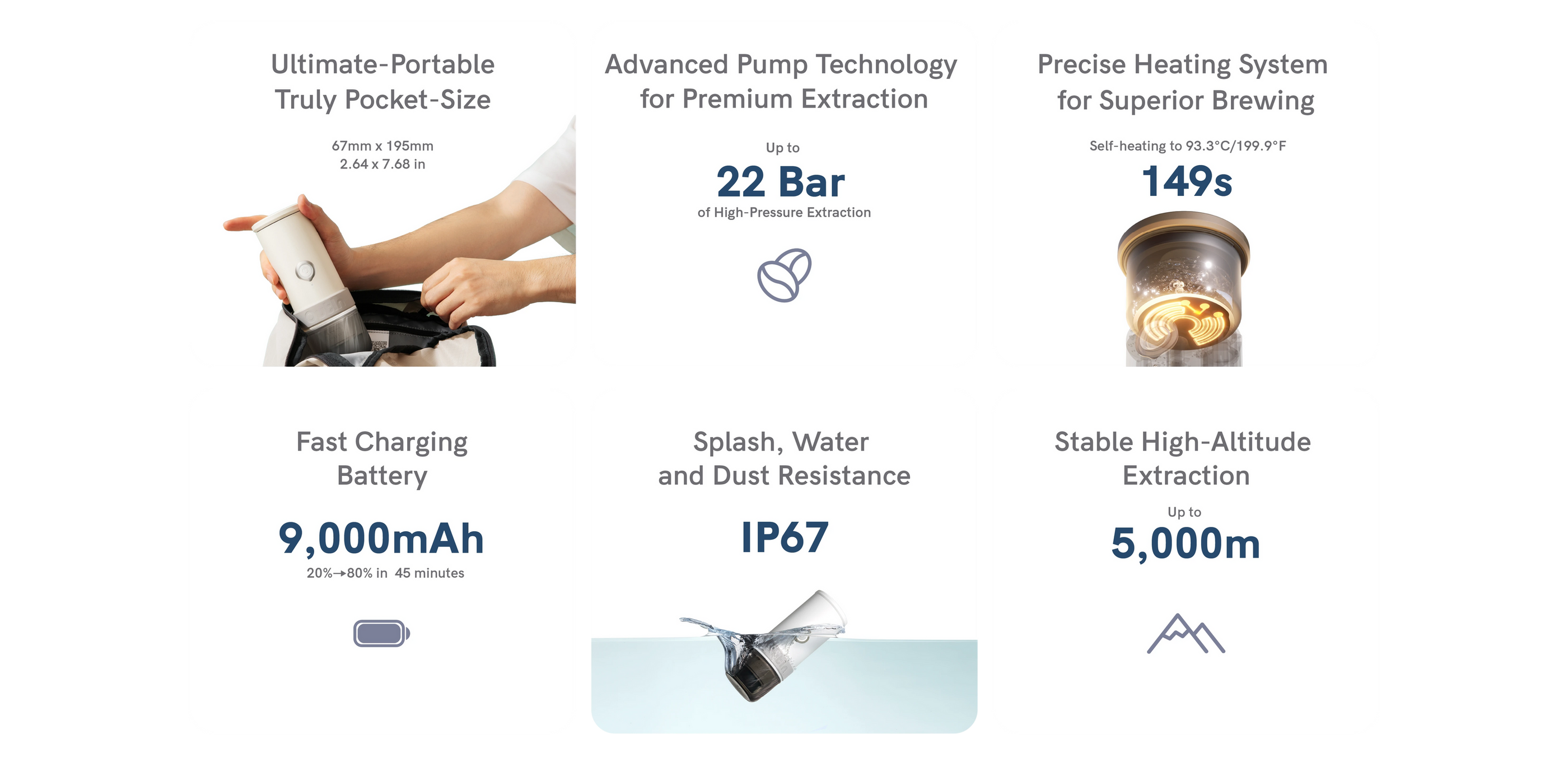 Batterie und Aufladung: 9.000 mAh Akku ermöglicht bis zu 6 Tassen pro Ladung (mit kaltem Wasser) oder über 500 Tassen mit heißem Wasser. Schnellladung: Von 20 % auf 80 % in 45 Minuten, volle Ladung in ca. 90 Minuten über USB-C.
